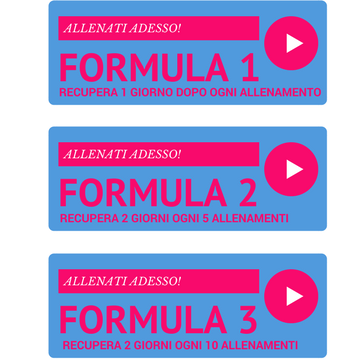 Puoi intervallare un giorno di riposo tra un all’allenamento e l’altro (formula 1) o fare 5 allenamenti consecutivi recuperando solo il fine settimana (formula 2) oppure, nel caso tu sia già una persona molto allenata, considerare la terza opzione: fare 10 allenamenti di fila senza giorni di pausa (formula 3)!