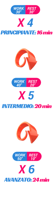 - Livello 1 o principiante: 30 sec work / 30 sec rest per 4 volte;